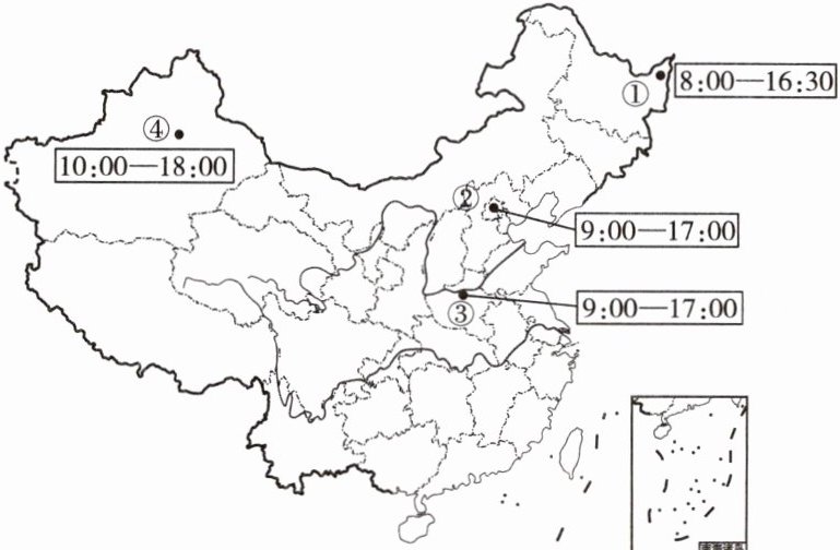 1. 图中①②③④四地邮局营业时间存在差异的主要原因是(