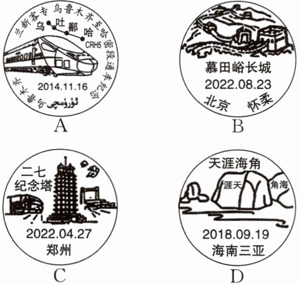 传统文化 邮戳 邮戳是邮局在信件、包裹等上加盖的戳记。邮政部门常会结合地域文化景观设计纪念邮戳。下图为我国部分邮局的位置和营业时间示意图。读图,完成1~2题。