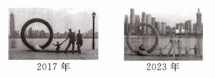 **典题3** **生活情境 雕塑品欣赏** 武汉汉口江滩上的雕塑作品《美好未来》(如下图)发生很大变化,由一家三口变成了一家五口,雕塑作品与社会发展同频共振的现象引起各界人士的关注。据此完成(1)~(2)题。