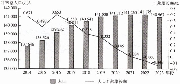 时事热点 退休政策 从2025年1月1日起逐步推行延迟法定退休年龄改革,这是职工法定退休年龄自20世纪50年代确定后,70多年来首次进行调整。如图示意2014—2023年中国人口数量和人口自然增长率变化情况。据此完成3~5题。