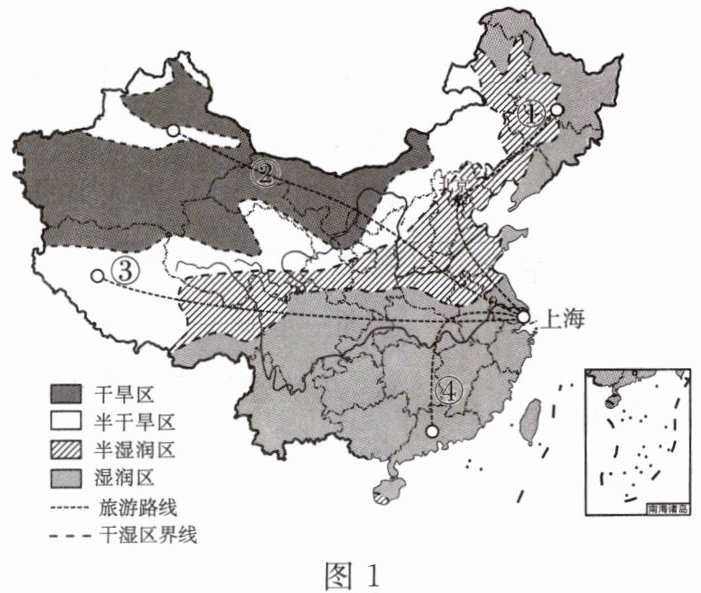 3. 图 1 中半干旱区与半湿润区的分界线大致相当于______毫米年降水量线。(