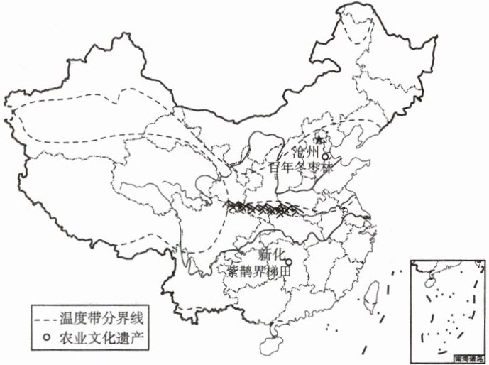 传统文化 农业文化遗产 我国拥有丰富多样的文化遗产,下图示意部分农业文化遗产分布及各温度带对应的作物熟制。读下图,完成 1~2 题。