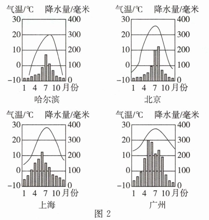 。(4)读图2中的四地气温,分析我国东部地区夏季和冬季气温分布特点。