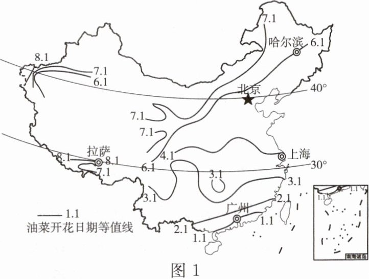 。(3)图1中上海和拉萨两地纬度相近,两地相比油菜开花日期较晚的是
