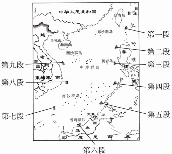 “九段线”又称南海诸岛归属范围线,是中国对南海海域权益边界的一种画法。这一海域蕴藏着丰富的石油、天然气资源,我国政府曾多次发表声明,指出中国对西沙群岛、南沙群岛及其周围海域拥有不可争议的主权,任何周边国家对这些岛屿的占领,均是对我国主权的侵犯。如图示意我国“九段线”位置。
