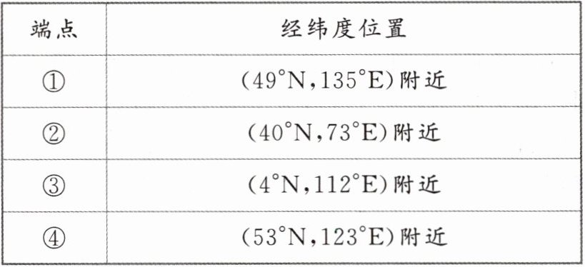 下表示意我国领土四端点的经纬度位置。据此完成 7~8 题。