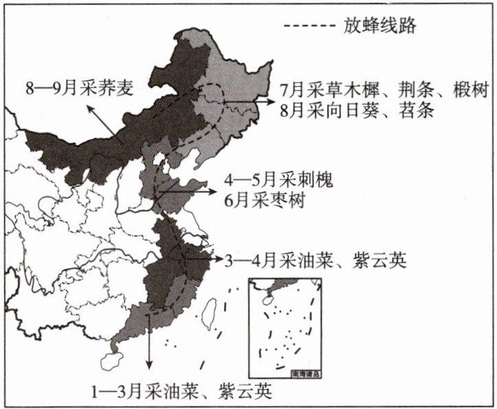 典题2 为了充分利用外地蜜源,蜂农需要频繁转场放蜂。读某地蜂农放蜂线路示意图,完成(1)~(3)题。
