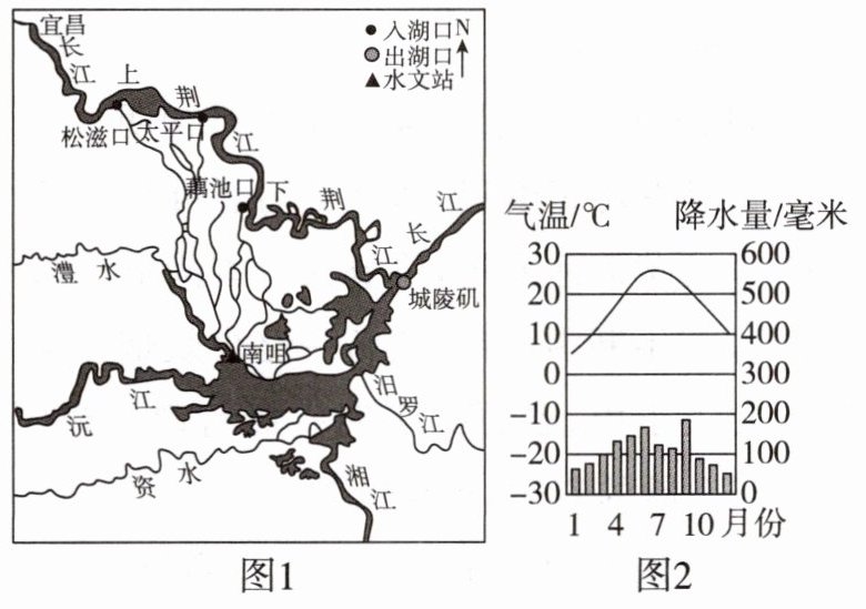 洞庭湖是我国五大淡水湖之一,不同季节的湖水面积差别很大,在5—10月湖水面积可维持在2000平方千米左右,在11月至次年4月仅有311.56平方千米。如图示意洞庭湖区(图1)和洞庭湖区气候资料(图2)。