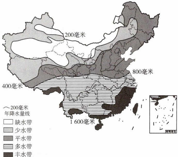 我国水资源空间分布不均。读我国径流带分布图,完成1~2题。