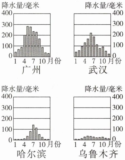 我国水资源时间分配不均。读我国四个城市各月降水量柱状图,完成3~4题。