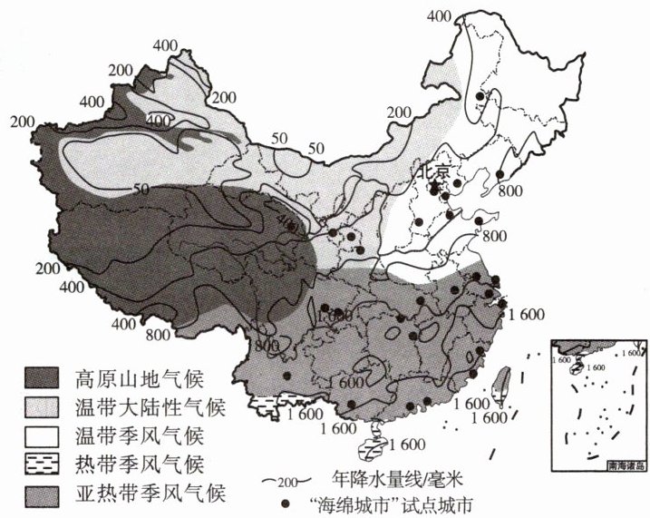 “海绵城市”是指城市能够像海绵一样在适应环境变化和应对雨水带来的自然灾害等方面具有良好的“弹性”。如图为“海绵城市”示意图和我国“海绵城市”试点城市分布图。读图,完成7~9题。