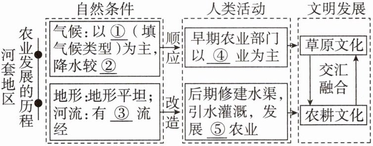 (1)河套地区是草原文化与农耕文化的交汇融合之地。结合所学知识,完成下列关系图。