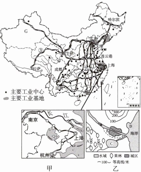 材料二 下图为中国铁路干线、主要工业基地分布图。