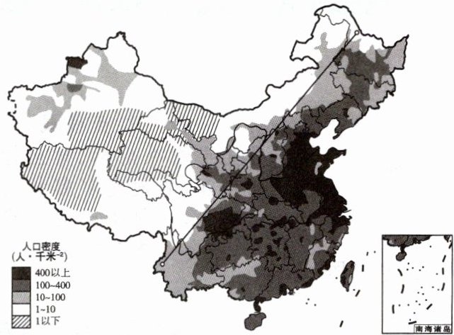 人口分布受社会经济条件、自然条件和开发时间(文明程度)等因素影响,同一社会形态,在一定时期内人口分布密度呈现地区差异。读我国人口密度分布图,完成 4~6 题。