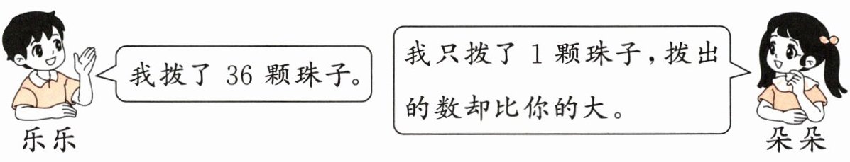 2.答:因为朵朵表示的数的最高数位比乐乐的高。例如朵朵在万位上拨1颗珠子,表示的数是10000,而乐乐在个位、十位、百位、千位上各拨9颗珠子,表示的数是9999,10000>9999。