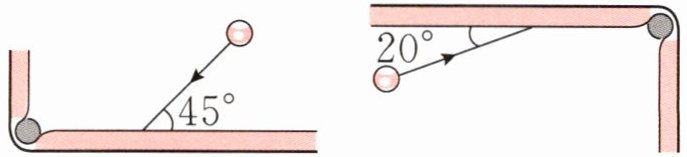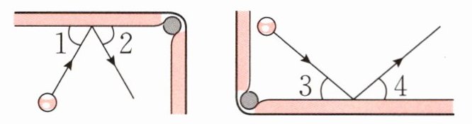 解析 先用量角器测量出题图中∠1、∠2、∠3、∠4的度数,再比较各角的度数大小并从中找出规律。规律:台球撞向球桌边框时的运动路线与球桌边框的夹角度数等于台球从球桌边框弹出时的运动路线与球桌边框的夹角度数。最后根据此规律补全题图中台球的运动路线即可。