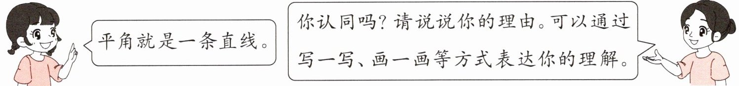 四、答:我不认同。因为平角是由一点引出的两条射线所组成的图形,这两条射线方向相反,在同一条直线上,有一个公共端点,而直线没有端点。所以平角就是一条直线的说法是错误的。