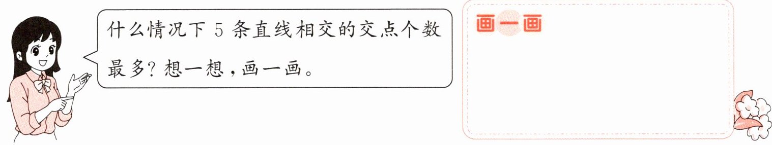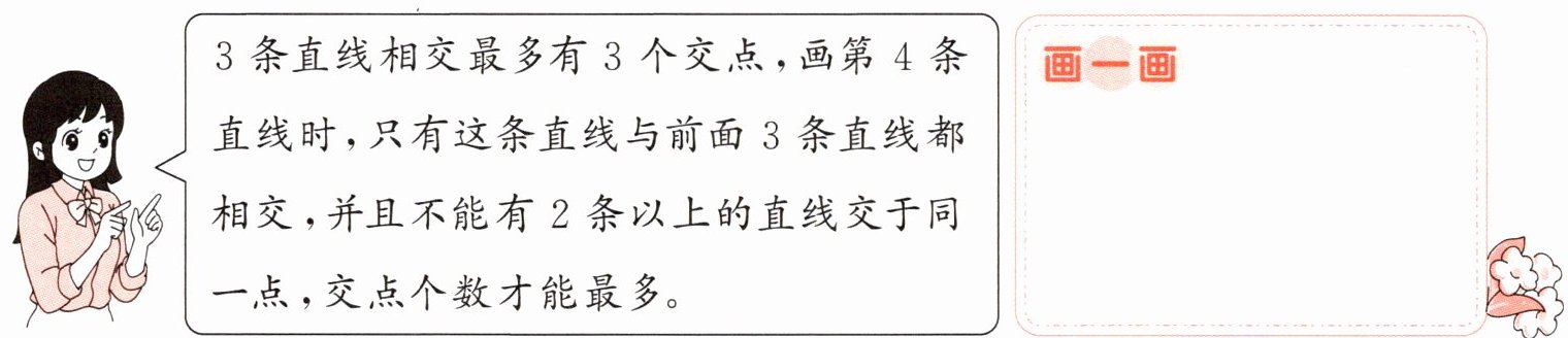 2 在同一平面内,4条直线相交最多有几个交点?画一画,想一想。