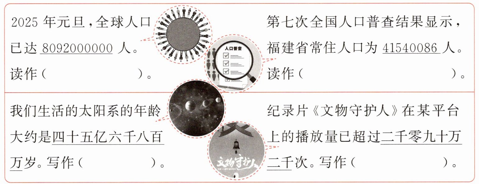 )。第七次全国人口普查结果显示,福建省常住人口为$ \underline{41540086} $人。读作(
