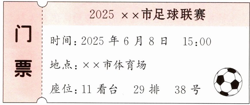 6 小亮去看足球比赛,下面是他的门票,他的座位是足球场最后一个看台最后一排的最后一个座位。如果每个看台的排数相同且每排的座位数相同,那么你能估算出这个足球场的看台区大约有多少个座位吗?