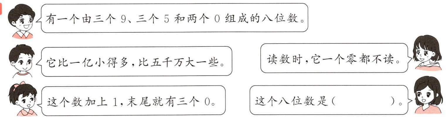 6. 55005999 解析 第一步 比一亿小得多,比五千万大一些,说明这个数最高位上的数字是5。 第二步 这个数加上1,末尾就有三个0,可知三个9放在了最后的三个数位上。 第三步 读数时一个零都不读,则两个0在万级的末尾。 所以这个八位数是55005999。