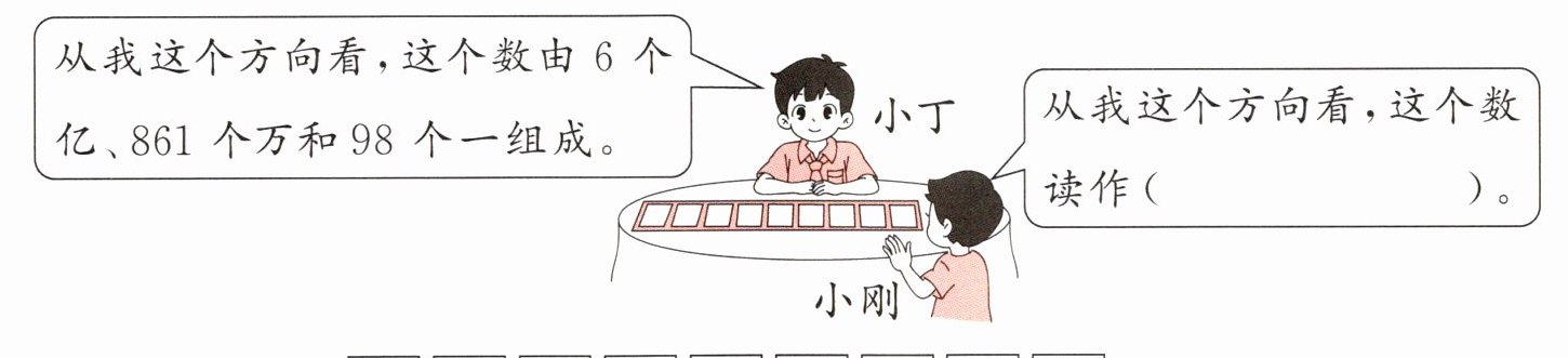 5 如图所示,桌子上放着一张写着九位数的卡片。请你根据小丁看到的数分析一下小刚看到的数是多少,在方框中填出来,并补充小刚的对话。