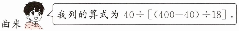 (2)某支财富小队用价值 400 元的货币购买了 18 份相同的理财产品后,还剩 40 元。曲米列的算式如下,他解决的问题是(