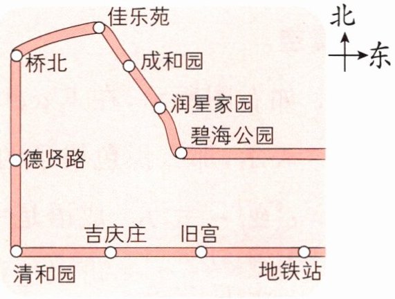 1.答:公交车从地铁站出发向西行驶3站到清和园,然后向北行驶2站到桥北,再向东北行驶1站到佳乐苑,最后向东南行驶3站到碧海公园。 2.地铁站或佳乐苑
