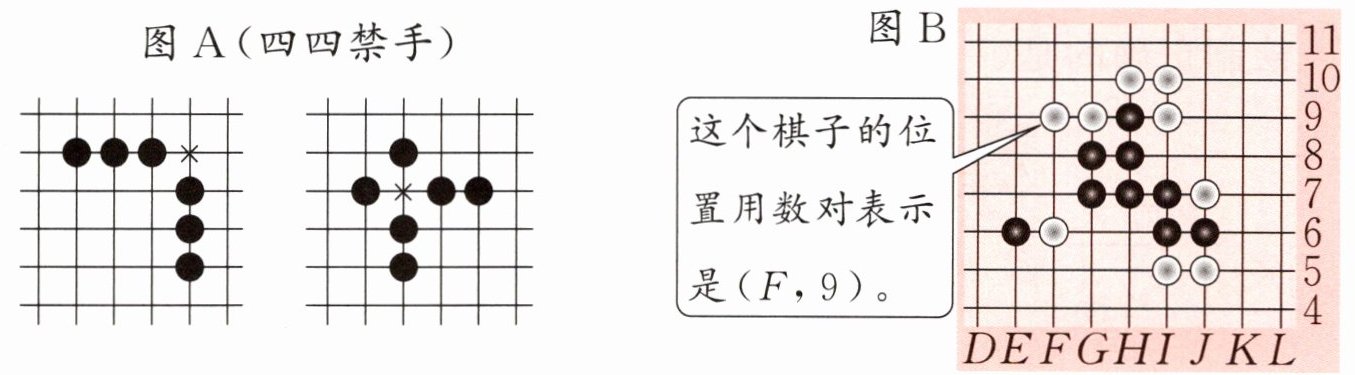 下五子棋时,率先将 5 颗棋子连成一条线的一方获胜(横、竖、斜均可)。黑方一子落下同时形成两个或两个以上的四,就称为“四四禁手”(如图 A)。在国际竞赛中,为限制黑棋优势,形成“四四禁手”视为犯规。