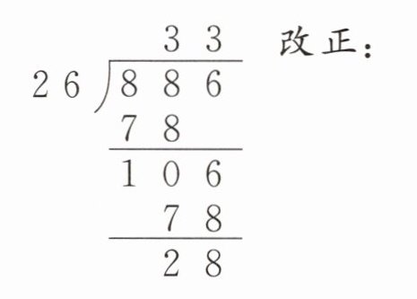 $\begin{array}{r}33 \\26 \enclose{longdiv}{886} \\78 \\\hline 106 \\78 \\\hline 28\end{array}$