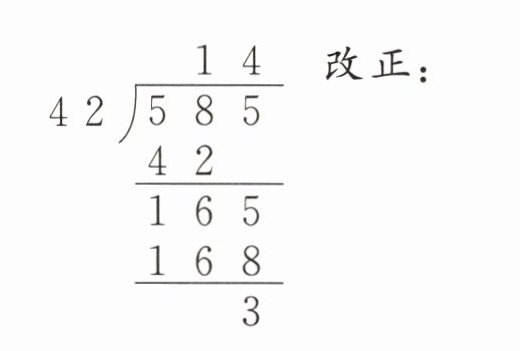 $\begin{array}{r}14 \\42 \enclose{longdiv}{585} \\42 \\\hline 165 \\168 \\\hline 3\end{array}$