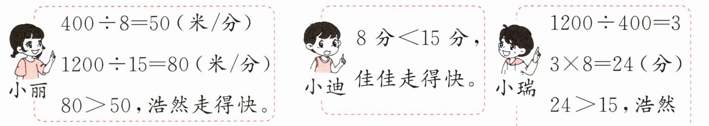 (2)佳佳和浩然相约去公园踏青,他们步行到达公园的情况如右表所示。谁走得快?小丽、小迪和小瑞三人的判断方法中,正确的只有(