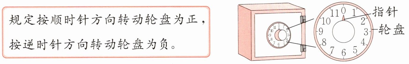 4 下面是一个保险箱,多次转动轮盘即可打开这个保险箱(指针固定不动)。指针一开始指向0,按照“$+3$”“$-5$”“$+6$”“$-1$”转动轮盘后,指针指向(
