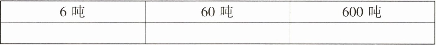 1. 一枚 1 元的硬币大约重 6 克。照这样计算,1000 枚 1 元的硬币大约重 6 千克,100 万枚 1 元的硬币大约重 6 吨,1 亿枚 1 元的硬币大约重多少吨?在合适的答案下面打“√”。