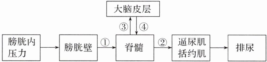 4. 当膀胱内贮尿量达到一定程度(400毫升左右),膀胱被动扩张,产生的压力会刺激膀胱壁感受器,引起排尿反射,过程如图。下列说法错误的是(