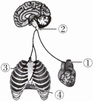9. (湖南湘潭中考)正常人体内的氧气和二氧化碳含量处于动态平衡,这与机体的调节过程有关。当流经主动脉的血液中二氧化碳含量上升时,主动脉中的感受器感知这一变化并产生神经冲动,神经冲动沿着传入神经传到②,最终使③和④收缩和舒张的频率加快,从而提高排出二氧化碳的效率。下列叙述错误的是(