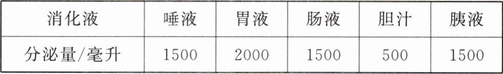 8. (江苏无锡中考)一个人在每天摄入800克食物和1200毫升水的情况下,体内各种消化液的分泌量如下表所示,下列有关叙述中正确的是(
