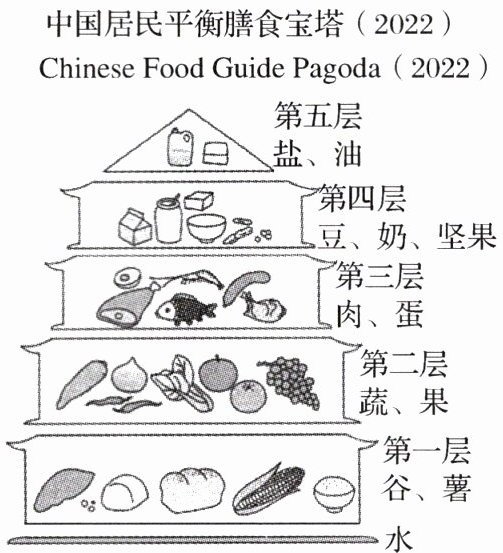 9. 中国营养学会设计的2022年版“中国居民平衡膳食宝塔”如图所示。正在生长发育的少年儿童每天应多吃一些富含蛋白质的食物,这些食物处于宝塔的 ()