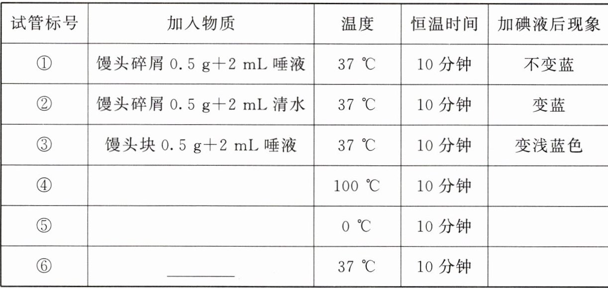 (3)有同学认为“淀粉不仅在口腔中消化,还会在胃中消化是因为受到了胃液中胃蛋白酶的作用”,为了验证这一观点是否正确,兴趣小组的同学们又进行了补充实验,增设试管⑥,记录如下表所示: