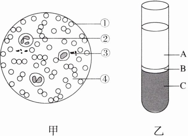 4. 血液是一种“流动的组织”,具有运输、防御保护等重要功能。图甲是显微镜下人血涂片的视野图,图乙是血液的分层图,下列相关分析正确的是(