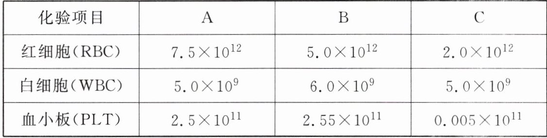 。(2) 高原地区空气稀薄,含氧量低,生活在高原地区的人血液中红细胞含量一般较高,以便从空气中获得更多的氧。下表是A、B、C三个人的部分血常规化验数据(正常参考值RBC:4.0×10¹²~5.5×10¹²个/L;WBC:4.0×10⁹~10.0×10⁹个/L;PLT:1.0×10¹¹~3.0×10¹¹个/L)。
