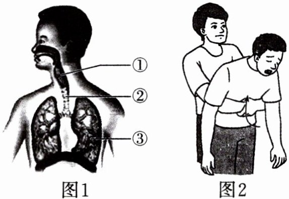 (3)若呼吸道被异物阻塞,危急情况下可采用海姆立克急救法实施救助(如图2)。在对儿童和成年人进行急救时,应快速向后上方挤压其上腹部。挤压会导致被救者膈顶部上升,此时肺内气压