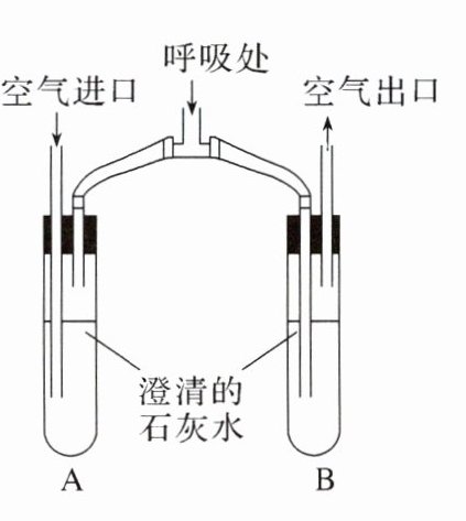 (1) 在“呼吸处”缓慢地吸气或呼气。吸气时,用夹子夹紧 B 试管的橡皮管;呼气时,夹紧 A 试管的橡皮管。进行多次后,