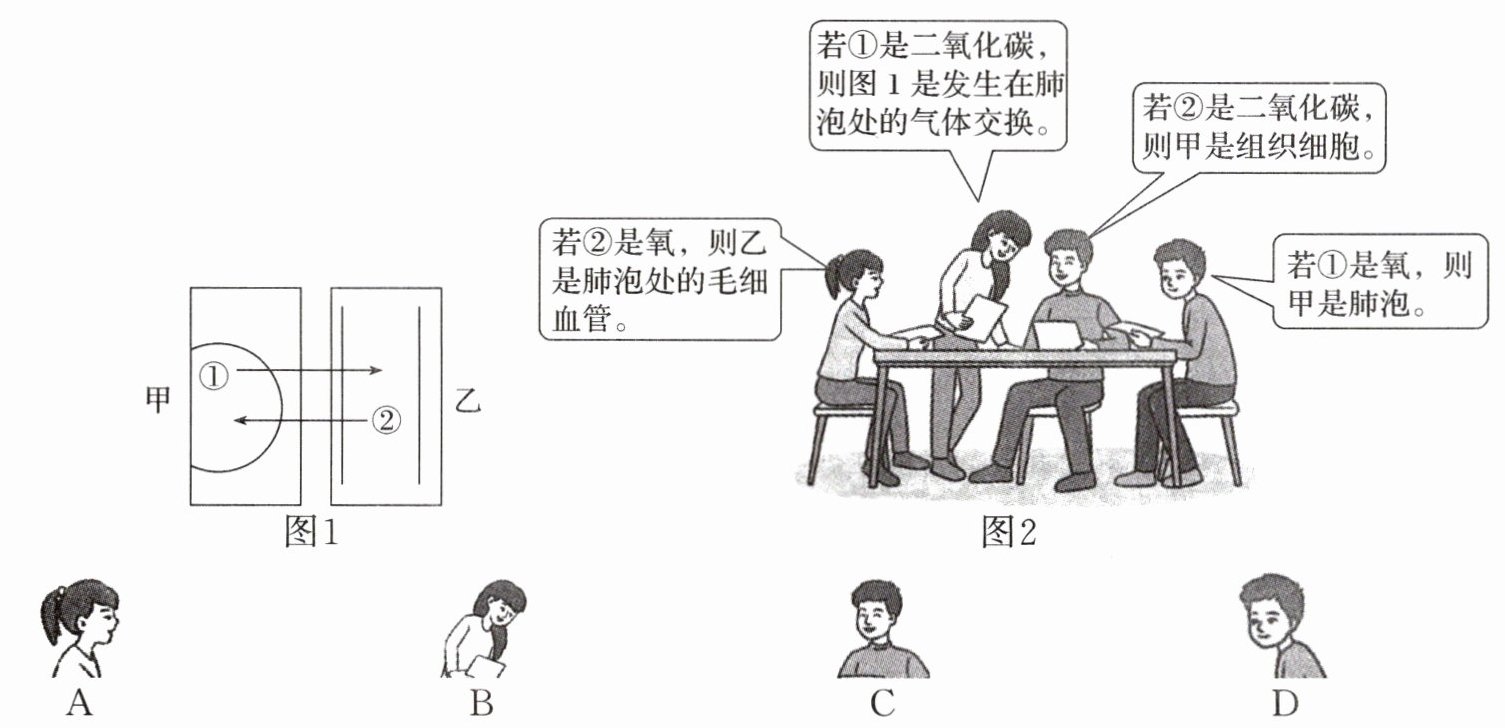 3. (陕西中考)图 1 是发生在人体肺部或组织细胞处的气体交换过程示意图,其中甲是肺泡或组织细胞的一部分,乙是毛细血管,①和②是不同气体,箭头表示气体进出方向。图 2 中四位同学关于图 1 的分析,正确的是(