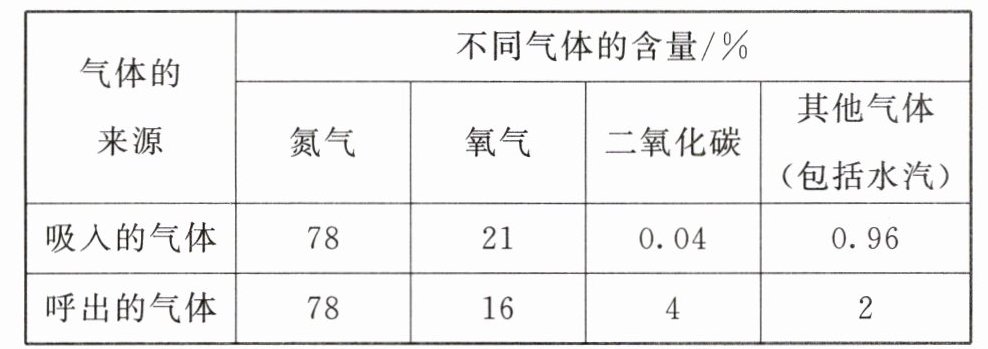 4. (甘肃平凉中考)下表为人体吸入、呼出的气体成分含量变化,呼出气体中的二氧化碳含量明显增加,这些二氧化碳最初来自(