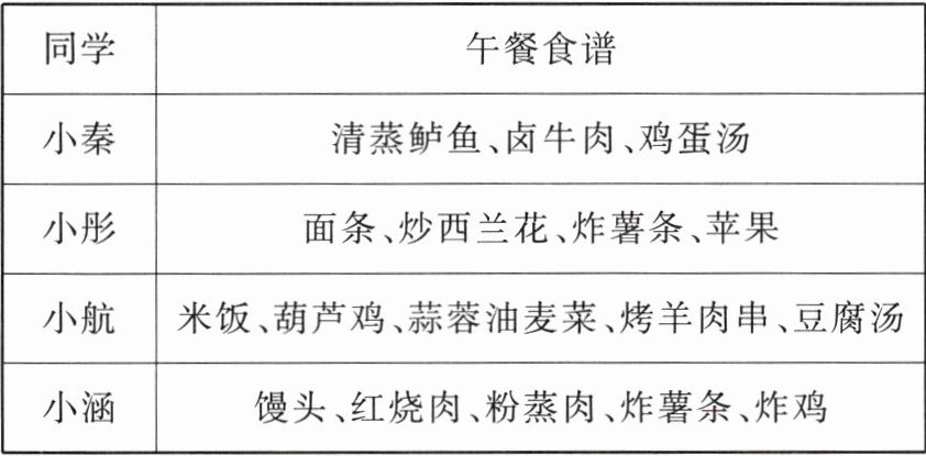 11. 小秦和同学们设计了如下表所示午餐食谱,其中午餐营养较为均衡的同学是(