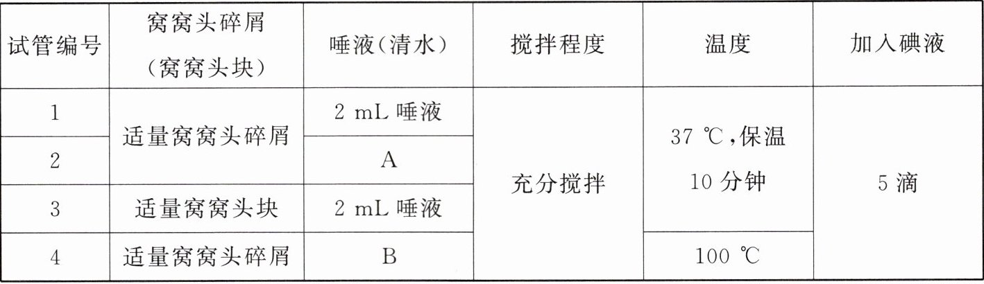 (1)选用 1 号和 2 号试管探究唾液对窝窝头是否有消化作用,在 2 号试管的 A 处应加入 2mL______。除此之外,1 号和 2 号试管的其他实验条件应______。1 号和 2 号试管中加入碘液后,不变蓝的应该是______号试管,原因是______。