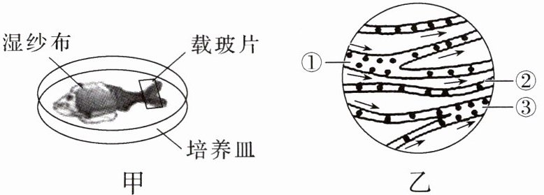 。(2)观察时发现血流速度最快的血管是图乙中的[ ]。通过观察,发现血液在三种血管内的流动方向是