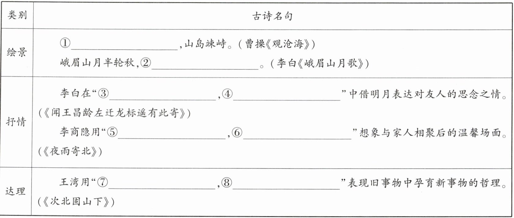 2.①水何澹澹 ②影入平羌江水流 ③我寄愁心与明月 ④随君直到夜郎西 ⑤何当共剪西西窗烛 ⑥却话巴山夜雨时 ⑦海日生残夜 ⑧江春入旧年