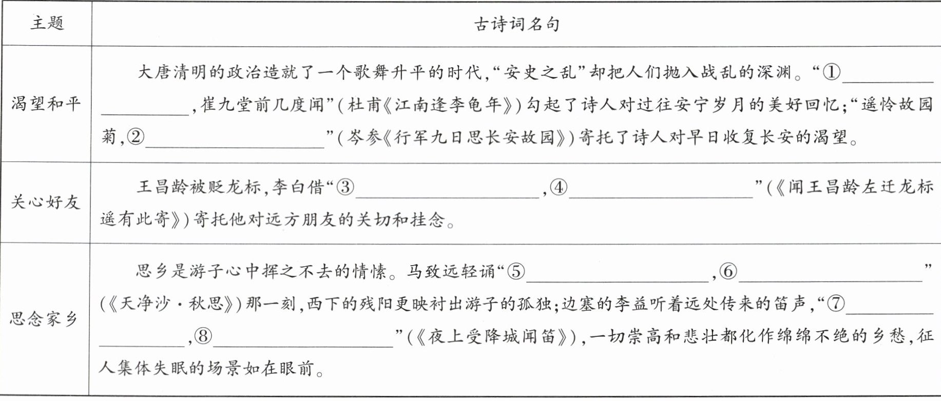 2.①岐王宅里寻常见 ②应傍战场开 ③我寄愁心与明月 ④随君直到夜郎西 ⑤夕阳西下 ⑥断肠人在天涯 ⑦不知何处吹芦管 ⑧一夜征人尽望乡